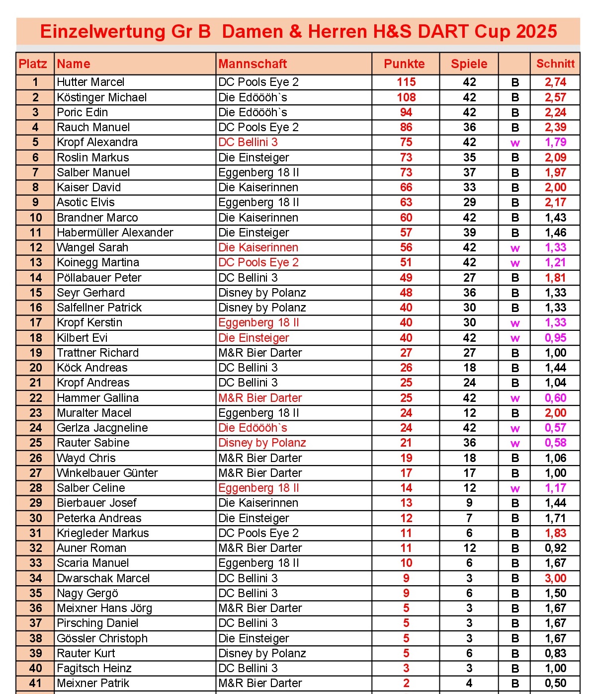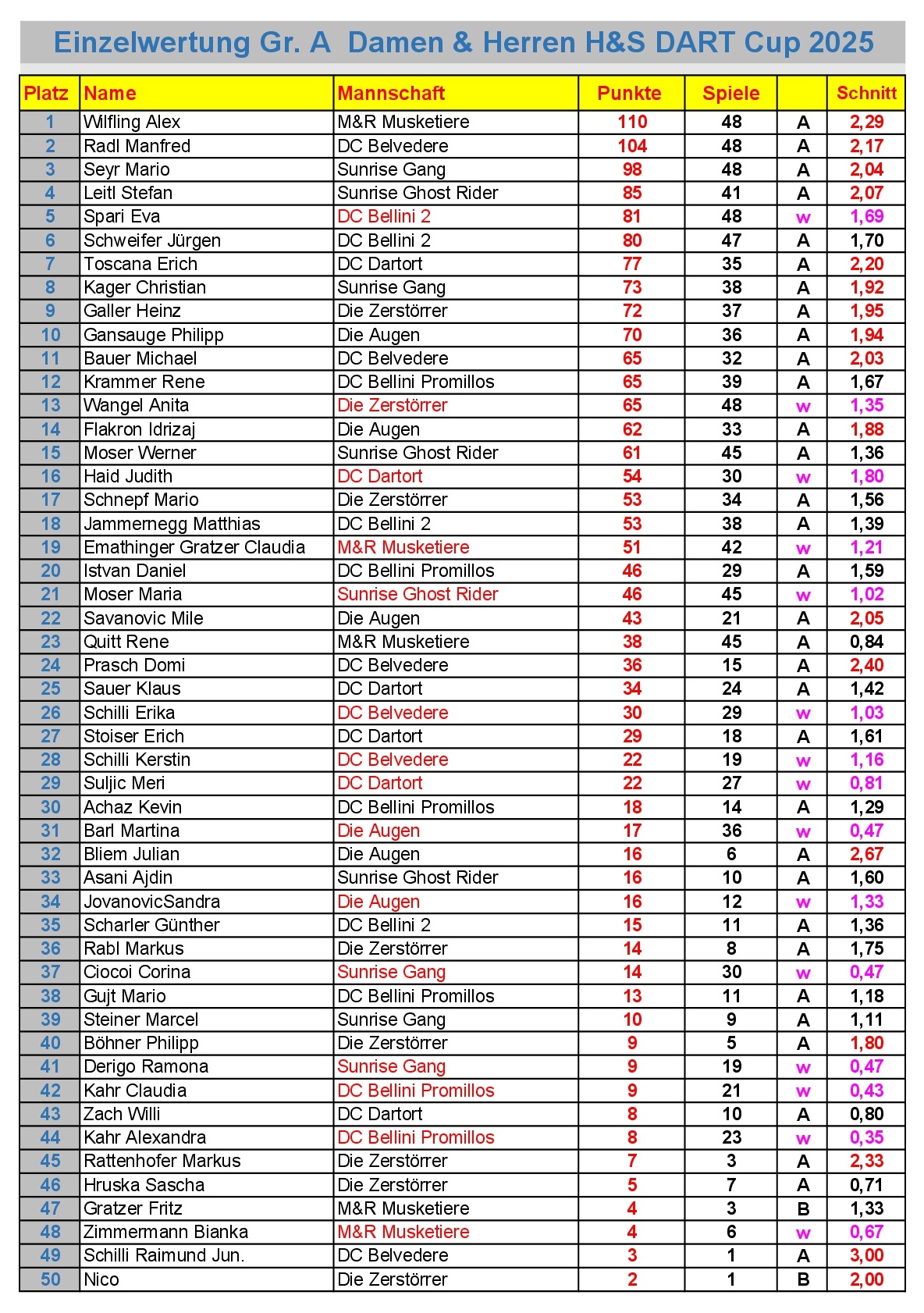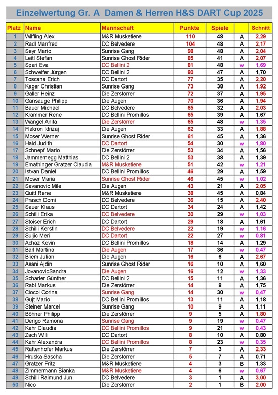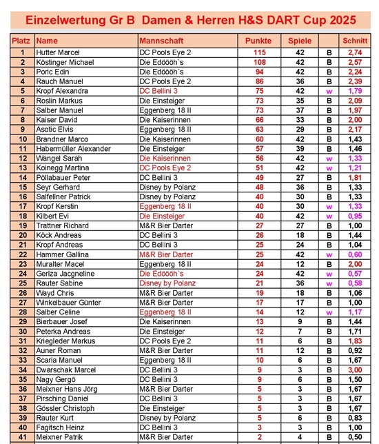 Einzelwertung H&S Dart