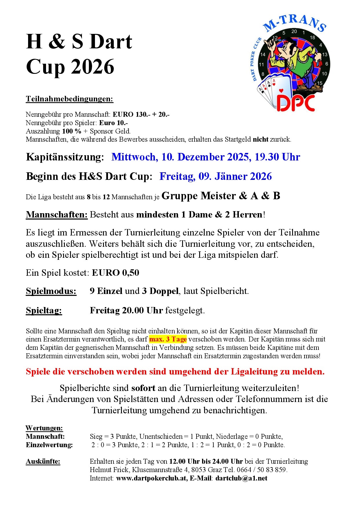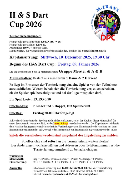 Beginn des H&S Dart Cup: Freitag 09. Jänner 2025